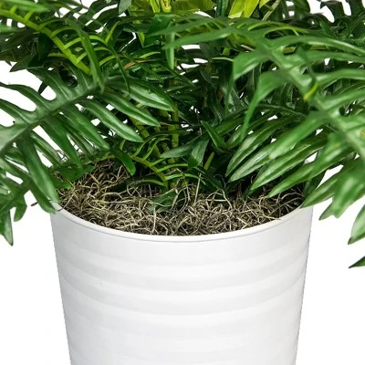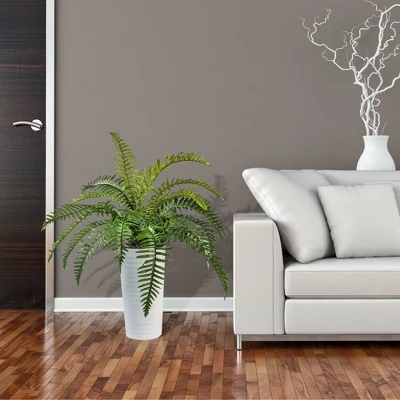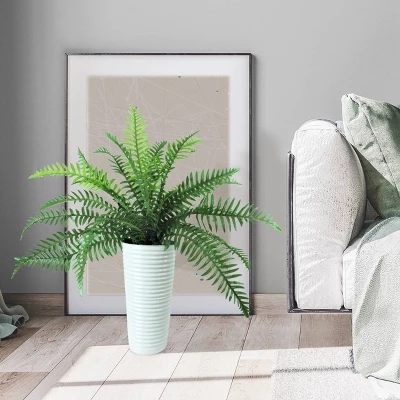 This arrangement of Fern fronds will stand tall in any environment. The ideally crafted luscious faux strands of green Fern leaves reach as much as three feet high from its white ribbed tapered metal vase. Enjoy the no care needed elegance of this Fern in its 15.5 inch high and up to 8.5-inch-wide planter combination whether at home or where you work. No care is needed other than an occasional light during and perhaps a primp or two. Ribbed Metal Planter