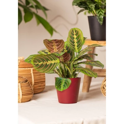 - The Red Veined Maranta houseplant prefers medium to bright, indirect light and is sensitive to direct sunlight. Best to place near an East or West facing window that is filtered by a thin curtain or blinds