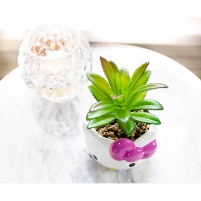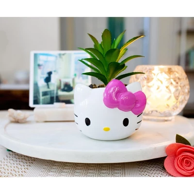 - MAKE A FUN STATEMENT: Spruce up your living space with fun home decor featuring Hello Kitty. This decorative indoor ceramic planter inspired by the cute cat comes with a faux succulent plant.